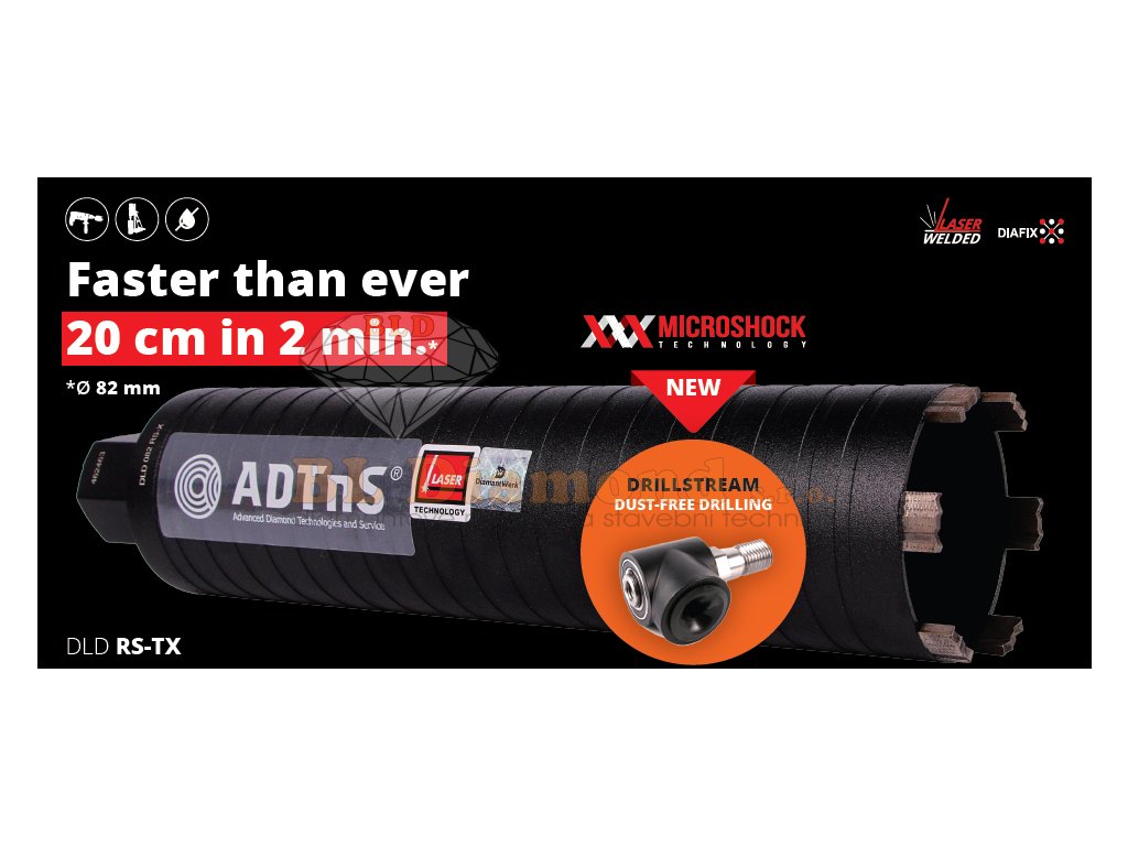Diamantové jádrové korunky DDS RS-TX jsou diamantové korunky s řazeným diamantem, které jsou určené pro jádrové vrtání za sucha s odsáváním a určené pro vrtání s mikropříklepem nebo bez na beton, armovaný beton, silně armovaný beton.