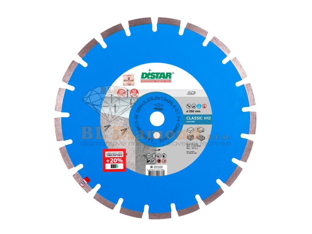 Kotouč je vhodný pro řezače spár o výkonu do 12 kW, stolní pily s výkonem do 5,5 kW nebo pro benzinové pily s výkonem do 4,5 kW nebo ruční rozbrušovací pily.
