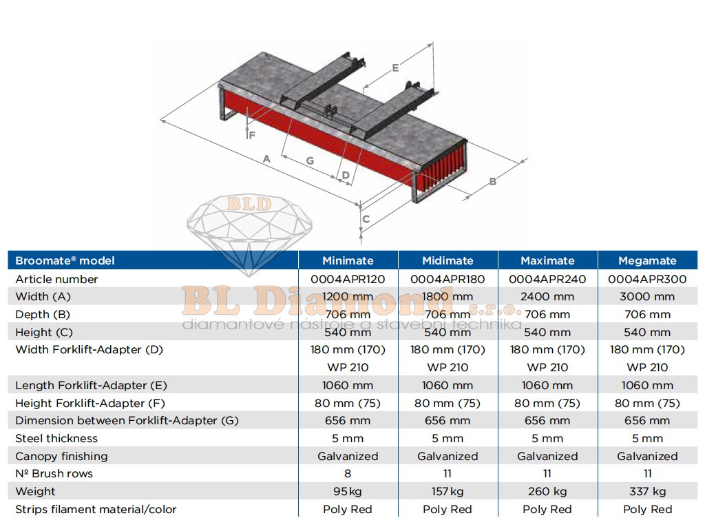 Rám zametače je vyroben z 5mm galvanizované oceli a jeho součástí jsou vodící drážky pro vidlice VZV nebo nakladače. Navíc je možné dodat koště s 3-bodovým závěsem, ale i s jiným typem uchycení.