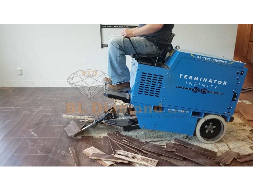 Škrabač / loupač Terminator INFINITY je nejnovějším členem rodiny elitních strojů na odstraňování podlah typu Terminator. Má velkou sílu a schopnosti potřebné k odstranění dlažby, parket, betonového potěru, lepenky, PVC, vinylu, koberců a mnoha dalších podlahových materiálů v kompaktním a snadno ovladatelném provedení.