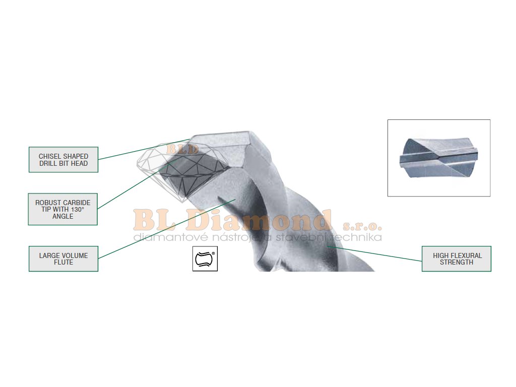 - Součástí vrtného břitu je i centrovací hrot pro stabilní osu vrtu